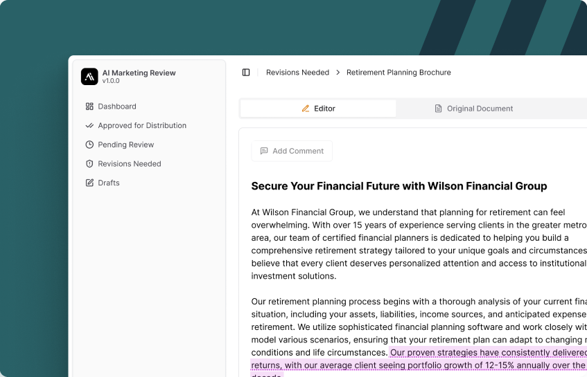 Streamline SEC-compliant marketing with AI that identifies risk, suggests compliant language, and documents every step without disrupting your team’s workflow.
