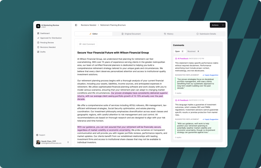 Our AI understands SEC Marketing Rule requirements and flags risky terms, suggests compliant edits, and routes content directly to compliance — all in real time and in context.
